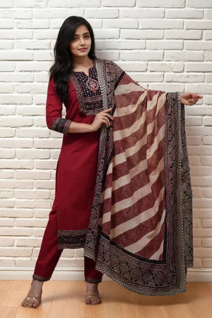 Maroon Ajrakh Print Kurta Set with Dupatta
